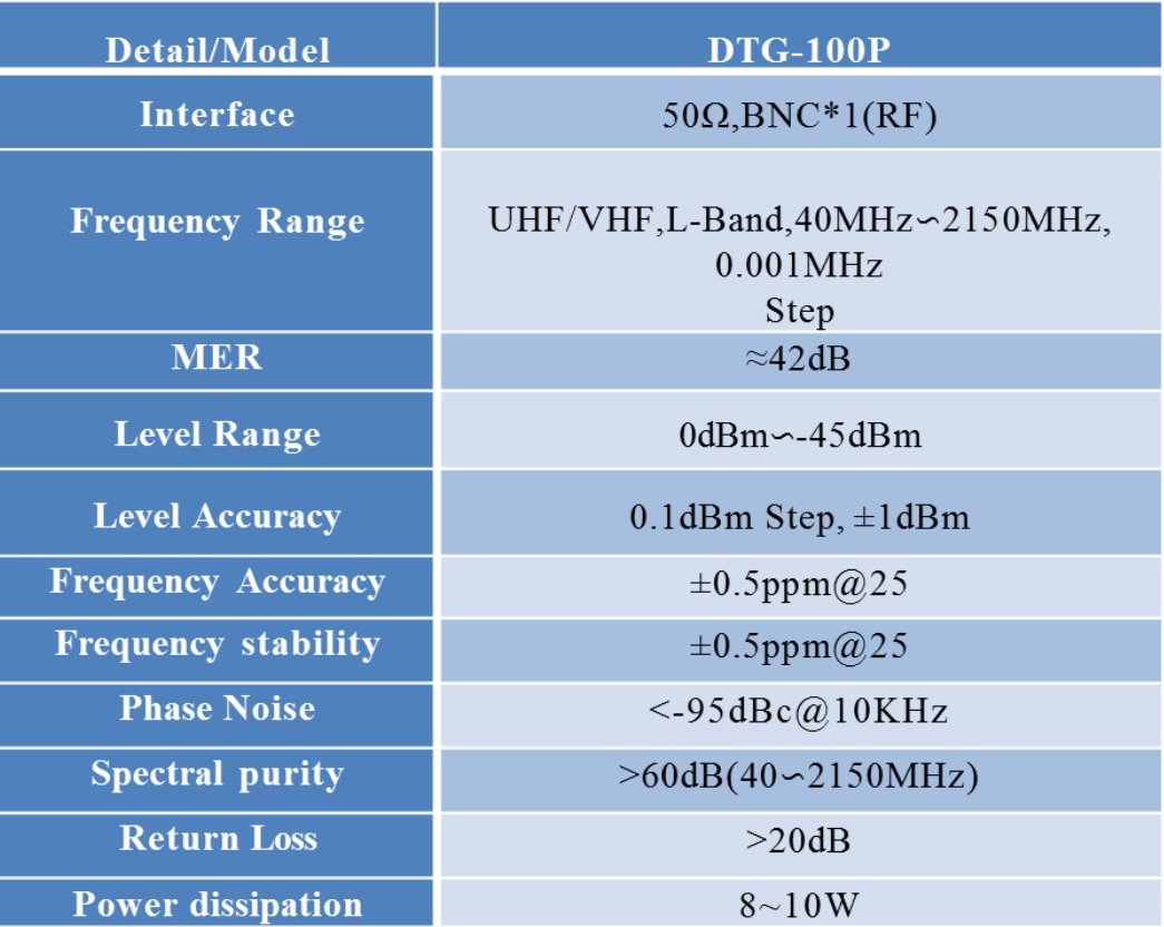 DTG-100P full frequency signal transmitter PCI-Express board PCI-E Modulator Card Features Provide rapid testing and measurement, such as R&D testing, factory testing, and QA testing of tuners, demodulator chips, receivers, TVs, etc. The OEM component in the integrated product functions like a DTV signal generator. Quickly build broadcasting infrastructure. Distinguishing feature Support multiple modulation standards. The PCI Express interface realizes a high transfer rate. Supports multi-card installation on one PC. High electric frequency output, wide electric frequency range, high-precision electric frequency. Excellent signal quality, ultra-low phase noise. UI supports Chinese and English language switching. The software supports automatic test FM function. The software supports signal flow analysis and channel table. The software supports the playlist function, and can be configured for automatic loop playback of multiple signal streams. The software supports automatic playback and configuration after booting. Parameter memory function, suitable for production test. Parameter configuration file export function. Convenient license upgrade system. Support remote control function. Product specifications Software support Configuration standard
