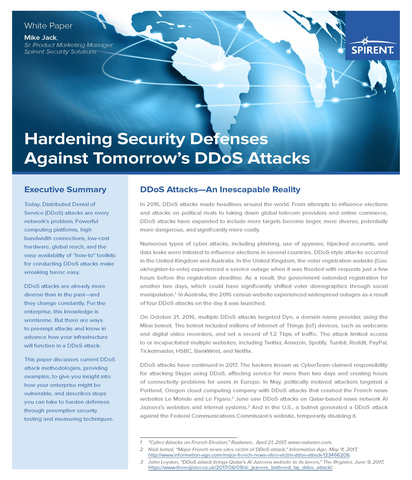 This white paper provides examples of current DDoS attack methodologies, insights into how enterprises might be vulnerable—and the steps that can be taken to harden defenses and security investment strategies through preemptive security testing and measuring techniques.