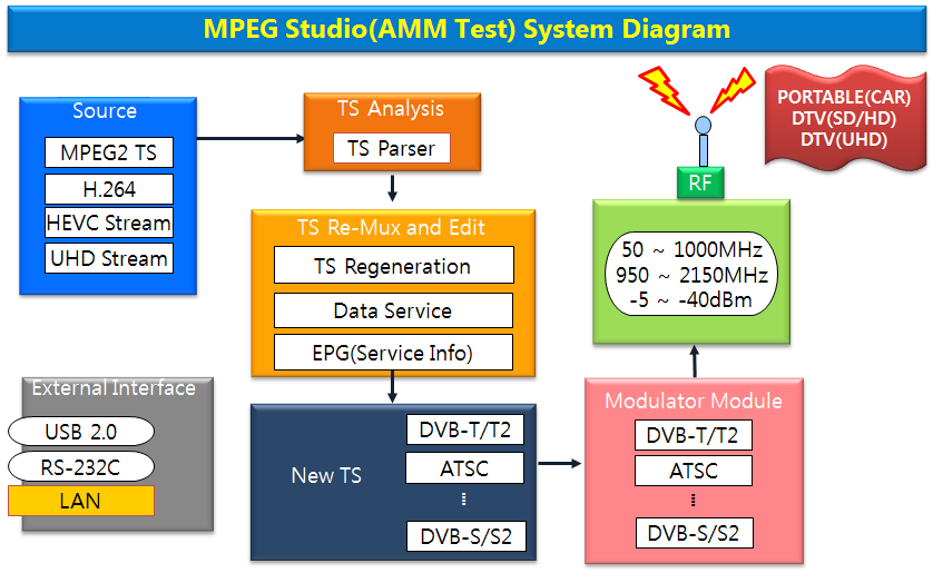 AMM Test là thiết bị tích hợp có thể Phân tích MPEG TS, dòng HEVC, Sửa đổi và Truyền ngay lập tức. ( hợp nhất MPEG Analyzer, Editor, RF Generator và hỗ trợ tất cả các thông số kỹ thuật phát sóng kỹ thuật số: DVB-T2 (MPLP, T2-MI), ISDB-T, DVB-S / S2)