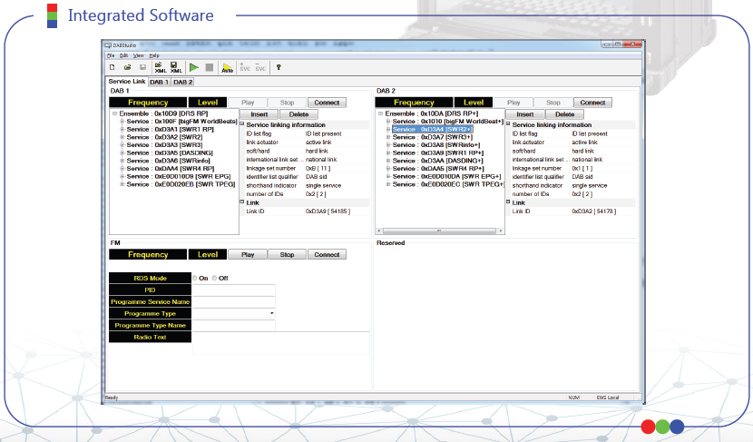 DAB Test Studio được tích hợp trong thiết bị có thể phân tích các tệp ETI, sửa đổi và truyền tải ngay lập tức.