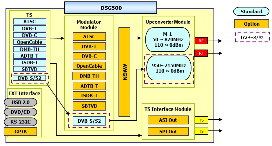 DSG500 tích hợp bộ tạo tín hiệu DTV hỗ trợ tạo tín hiệu MPEG2 TS và RF trong một thiết bị. Nó có thể bao gồm tất cả tiêu chuẩn DTV và tiêu chuẩn truyền hình di động trong một đơn vị bao gồm DVB-T, DVB-C, DVB-H, ATSC, OpenCable, DTMB (DMB-TH, ADTB-T), ISDB-T (SBTVD) và DVB- S / S2.